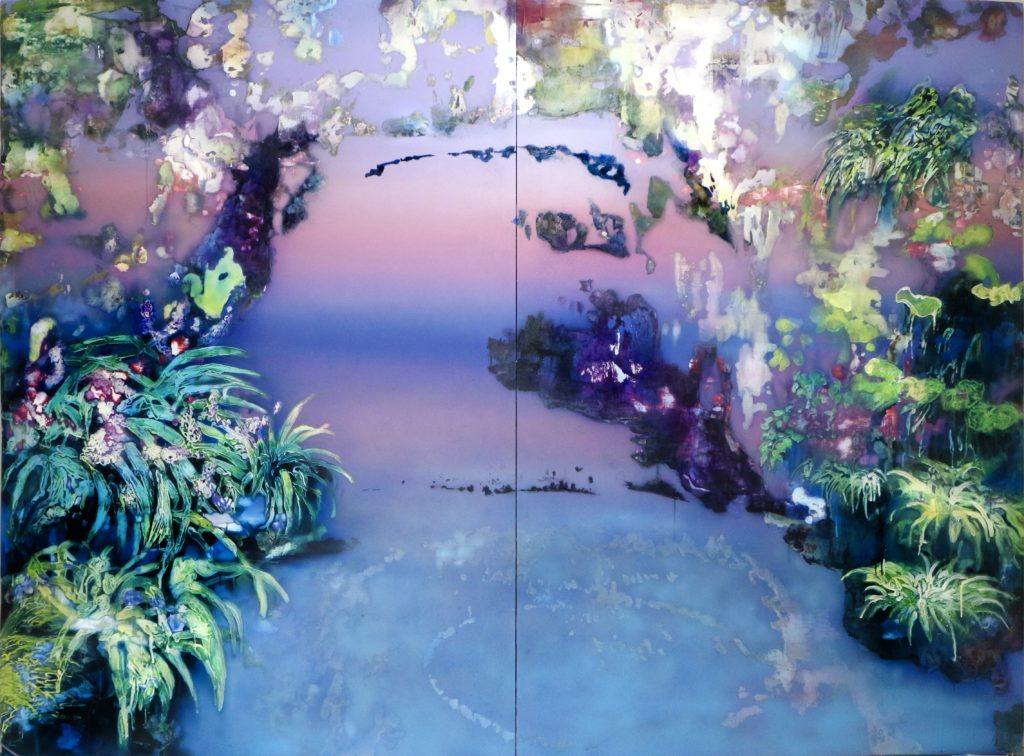 色のレイヤーを用いて幾重にも重なる「イメージを帯びた風景」を描き出し、異なる経験を持つ鑑賞者に既視感や時を超えた心象風景を想起させる。